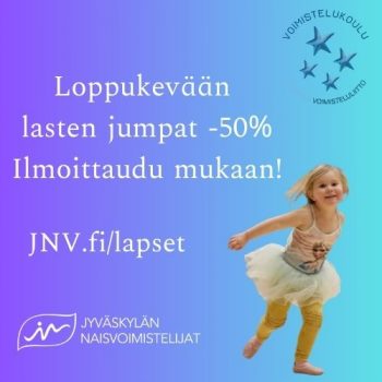 JNV:n kaikki loppukevään harrastetunnit ovat nyt -50%! Tämä koskee lasten harrastevoimistelua, IKILIIKE-tunteja sekä LatinBasic-tanssitunteja. Lisätietoja loppukauden alesta johanna.harju@jnv.fi