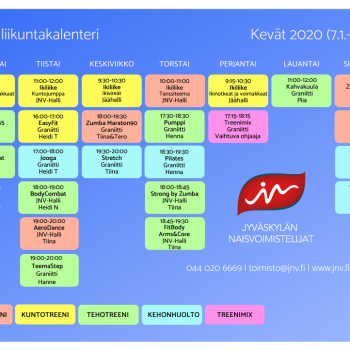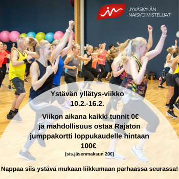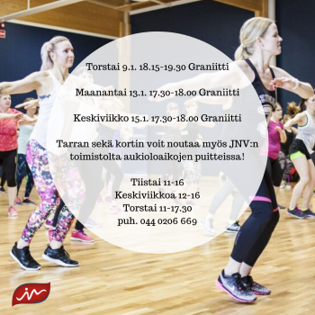 10.2.-16.2. kaikki pääsevät mukaan JNV:n ryhmäliikuntatunneille hintaan 0€. Viikon kuluessa on myös mahdollista ostaa Rajaton jumppakortti loppukaudeksi hintaan 100€(sis. jäsenmaksu 20€)! Tervetuloa hyvään seuraan liikkumaan!
