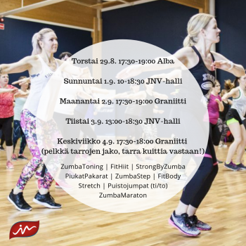 Jumppatori 1.9.2019 klo 15-18 Energiasali 15:00-15:30 JumppaBattle kaikki ohjaajat(esittely) 15:30-16:00 Zumba Tiina 16:00-16:30 Piukat pakarat Tiina 16:30-17:00 BodyCombat Heidi 17:00-17:30 Tanssiteema Lotta 17:30-18:00 Jooga Piia Elämän ilo-sali 16:00-16:30 Jooga Piia…