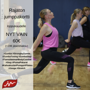 Rajaton jumppakortti loppukaudelle on tarjouksessa nyt! Vielä ehdit nauttimaan ryhmäliikunnan huumasta! Tsekkaa tuntikalenterimme täältä: https://jnv.fi/syksyn-ryhmaliikuntakalenteri-2-9-20-12/
